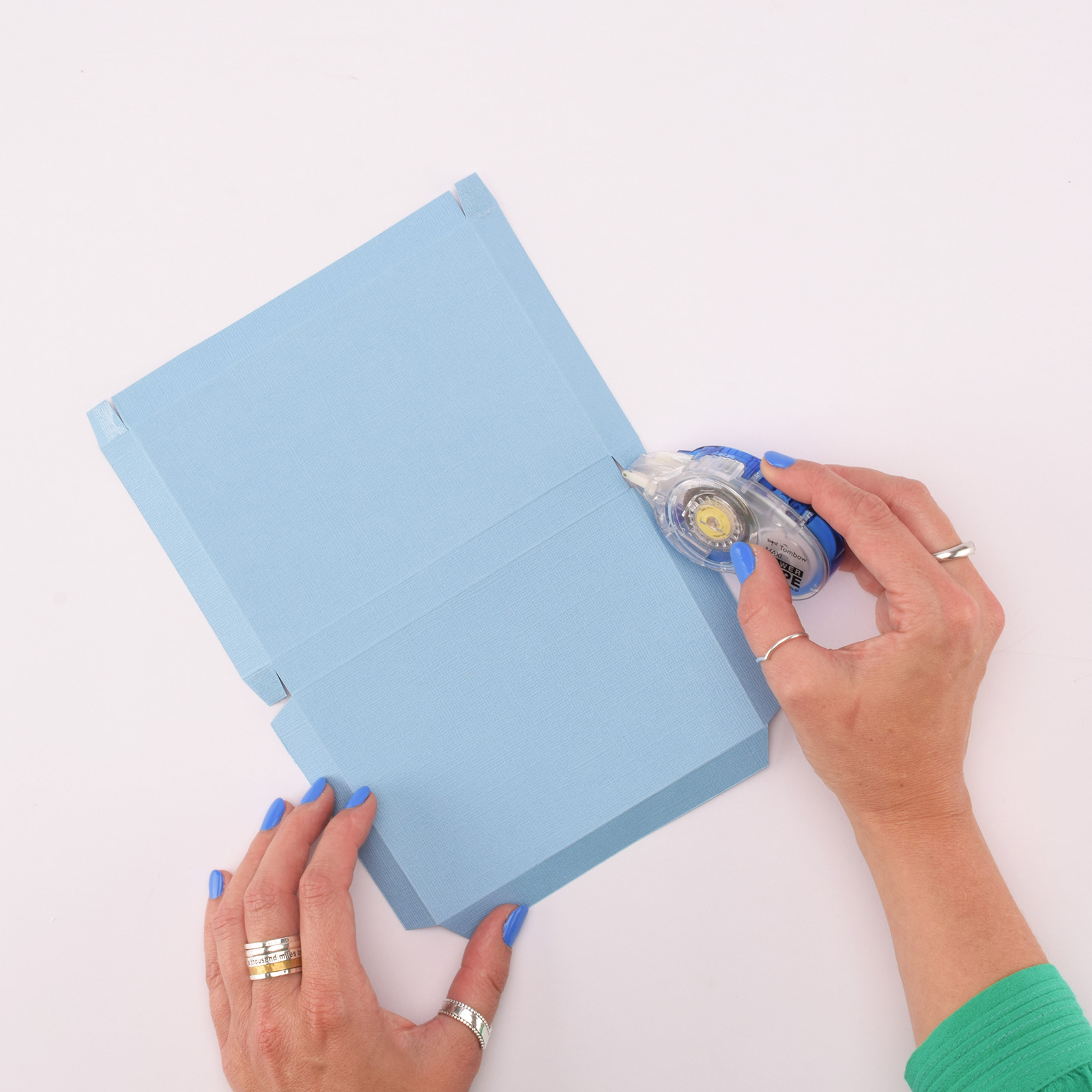 Gira di nuovo il foglio, piega gli angoli e incollali tra loro. Premi bene tutti gli angoli. Piega il coperchio verso l’interno e voilà, la tua scatola è pronta! Se vuoi, puoi decorarla con illustrazioni, hand lettering, collage o adesivi.