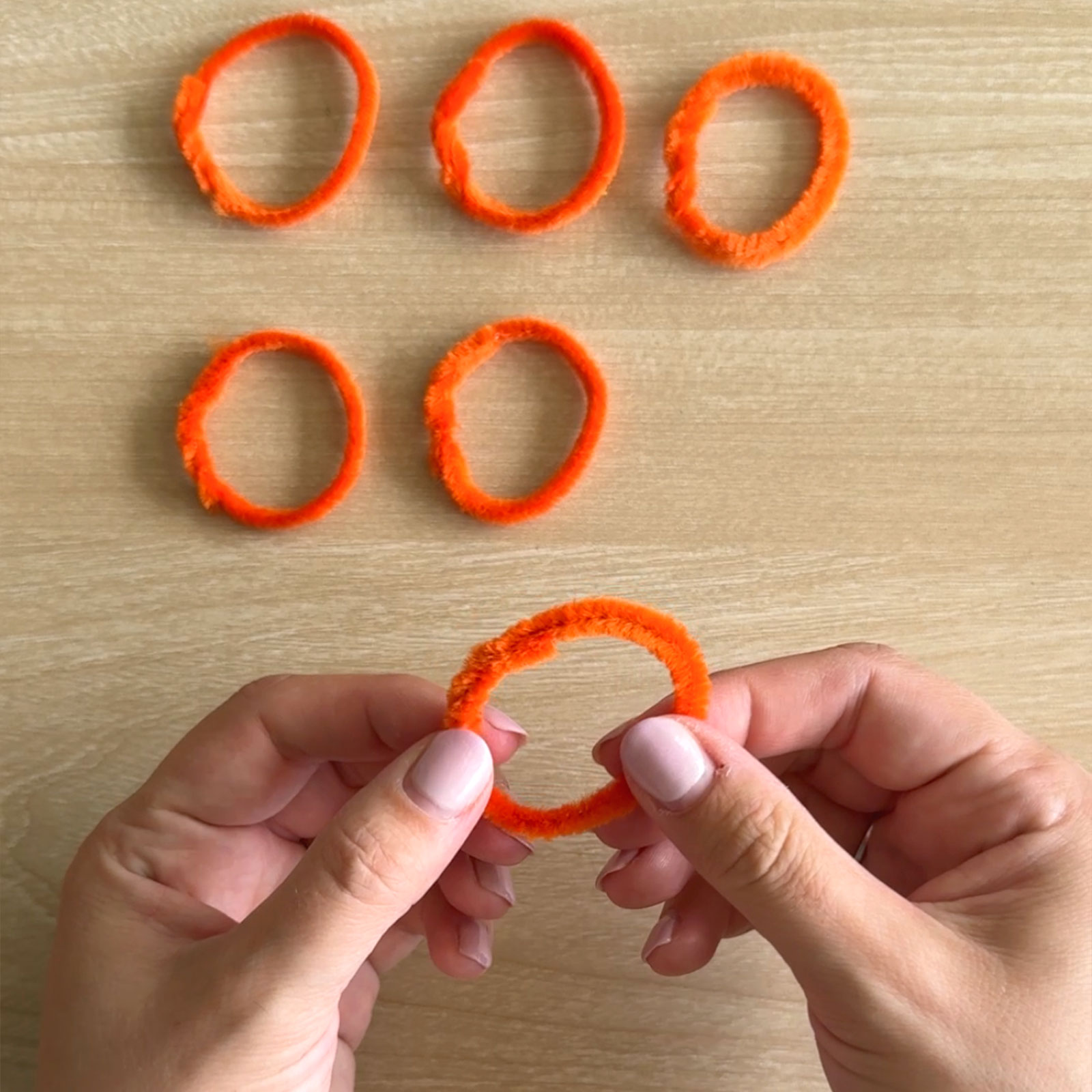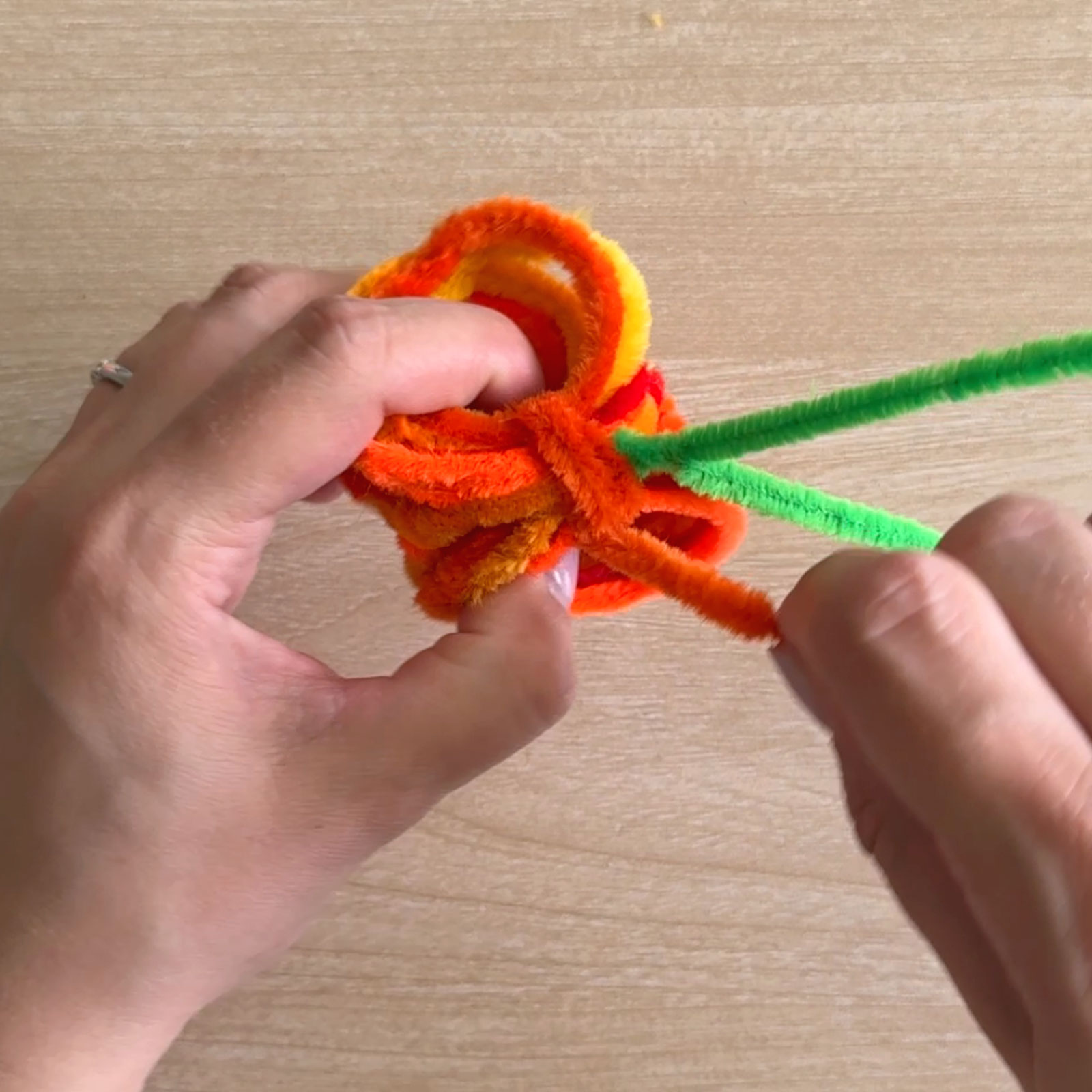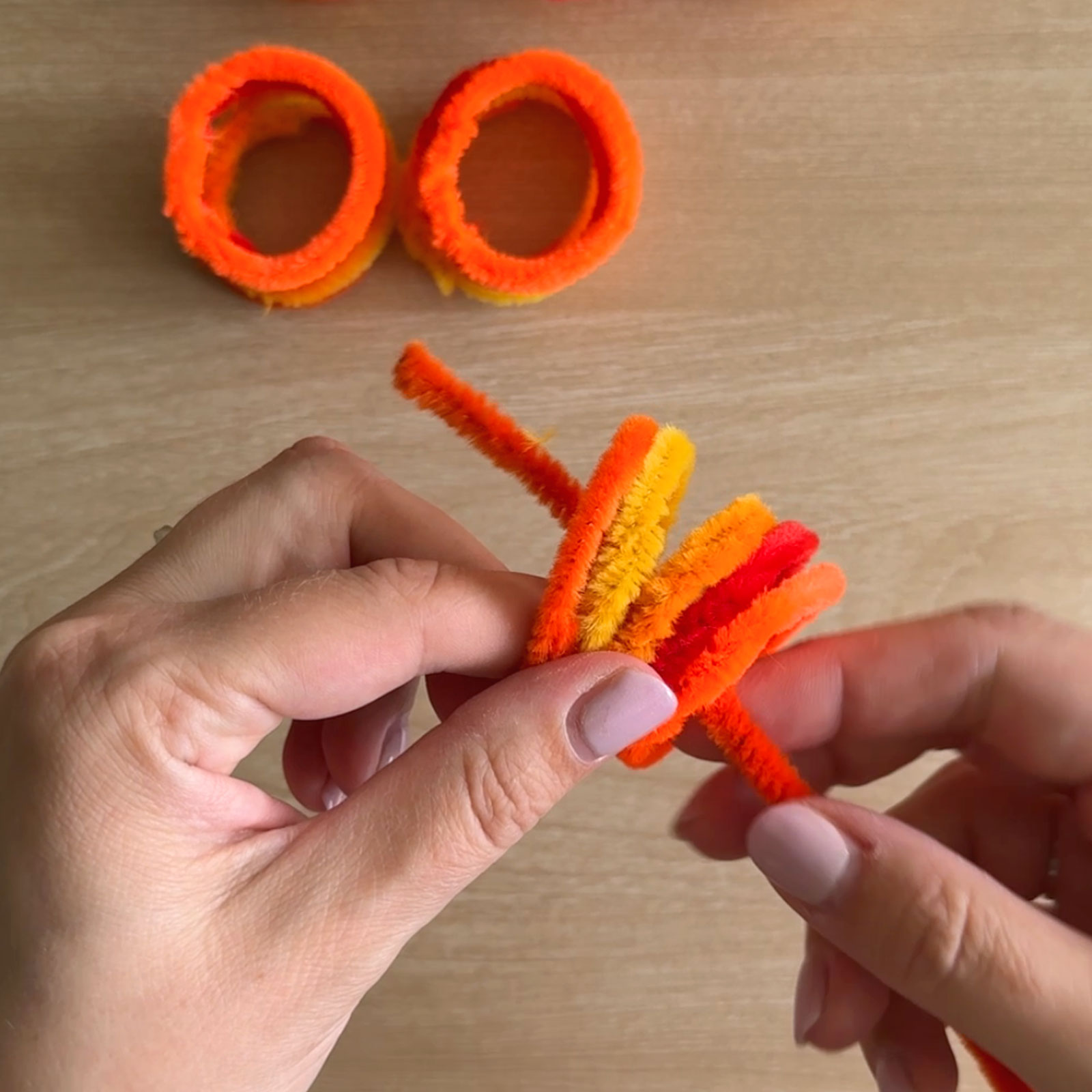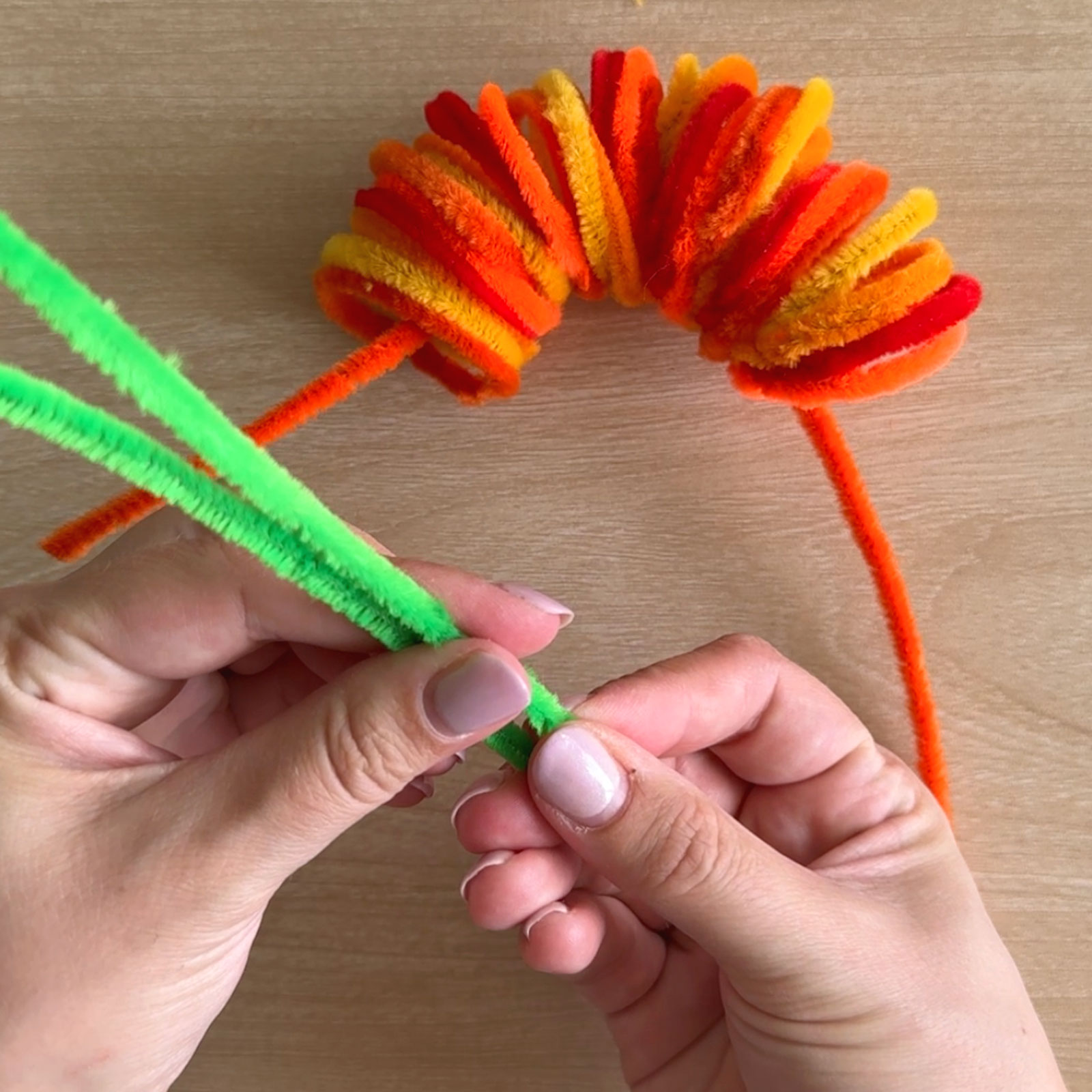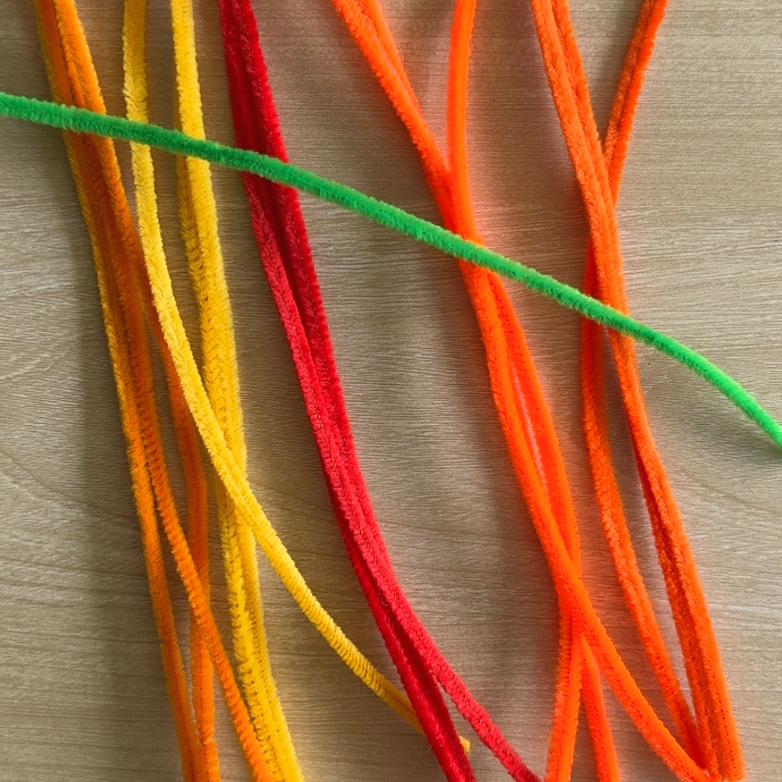 Usa scovolini arancioni e gialli, in totale 5 colori. Prendi 3 scovolini per ogni colore e 4 di un colore (metti da parte quello extra). Aggiungi anche uno scovolino verde.