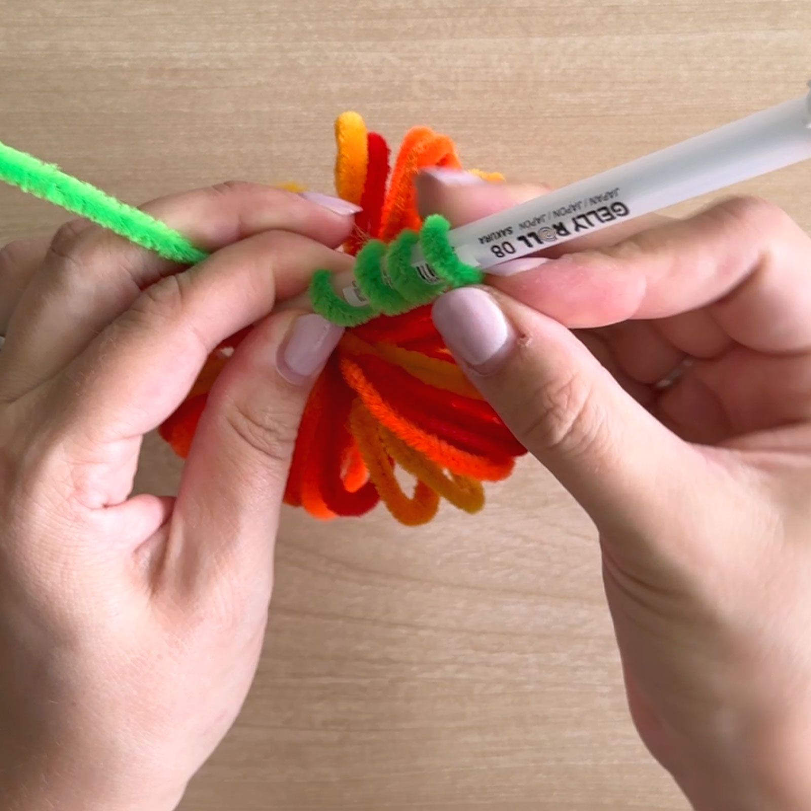 Infine, avvolgi lo scovolino verde intorno a una penna in modo che si arricci. Disponi i cerchi in modo uniforme e la tua zucca è pronta!