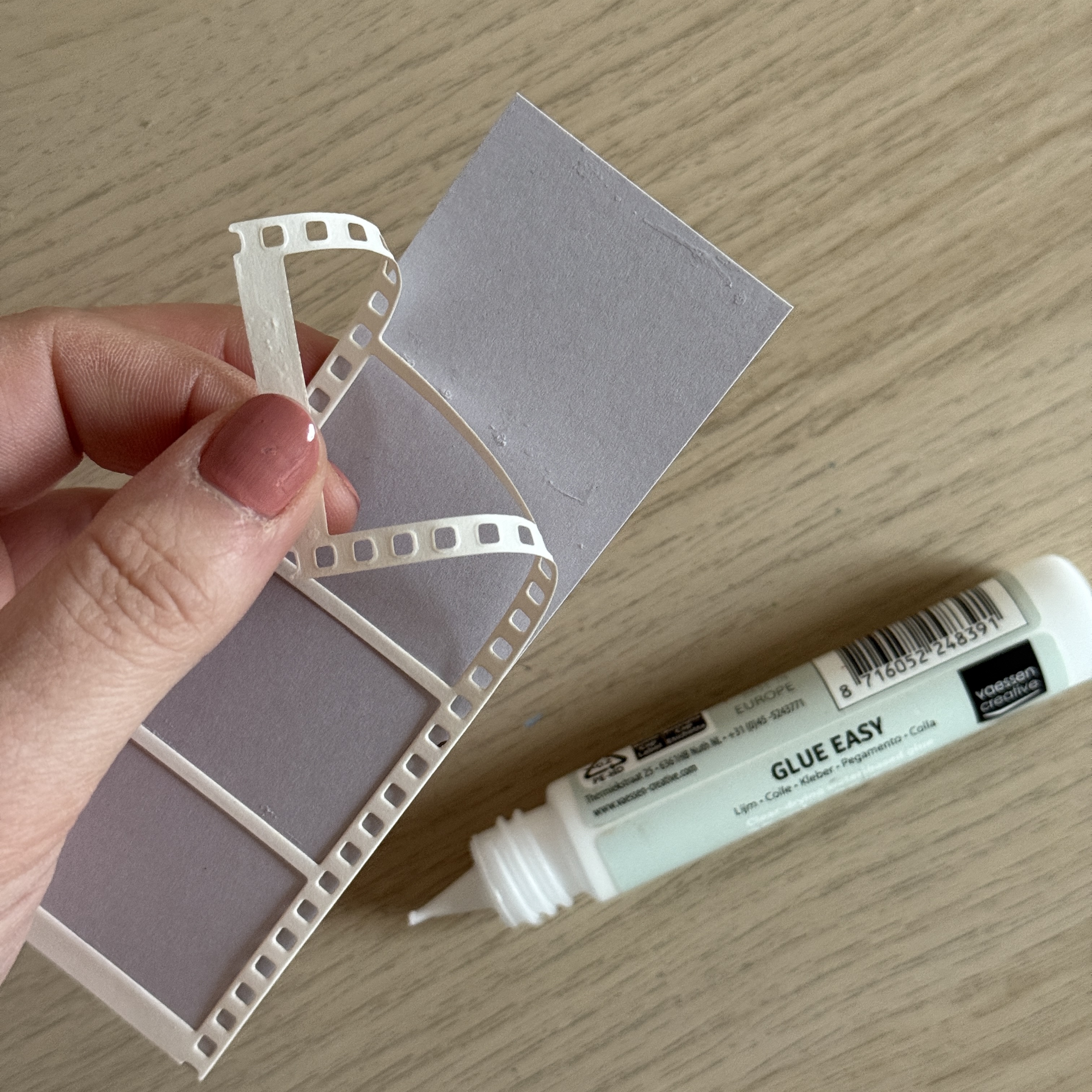 Plak de filmstrip op een strook papier van 4,5 × 14 cm (wij kozen voor dezelfde kleur als de basiskaart).