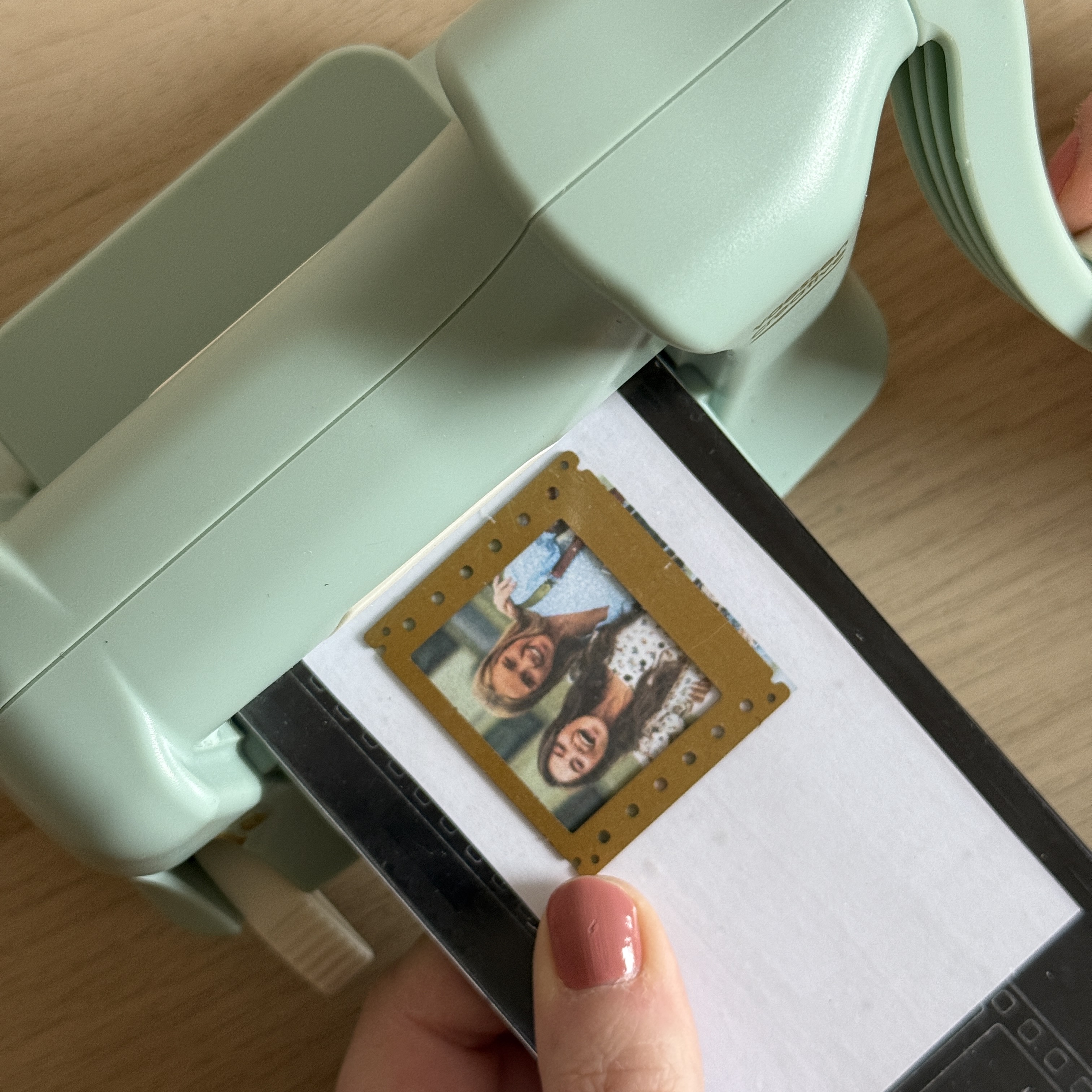 Print je foto’s minimaal 4 × 4 cm groot en stans ze uit met de mal uit de Vintage Camera-set (3625-0211).
