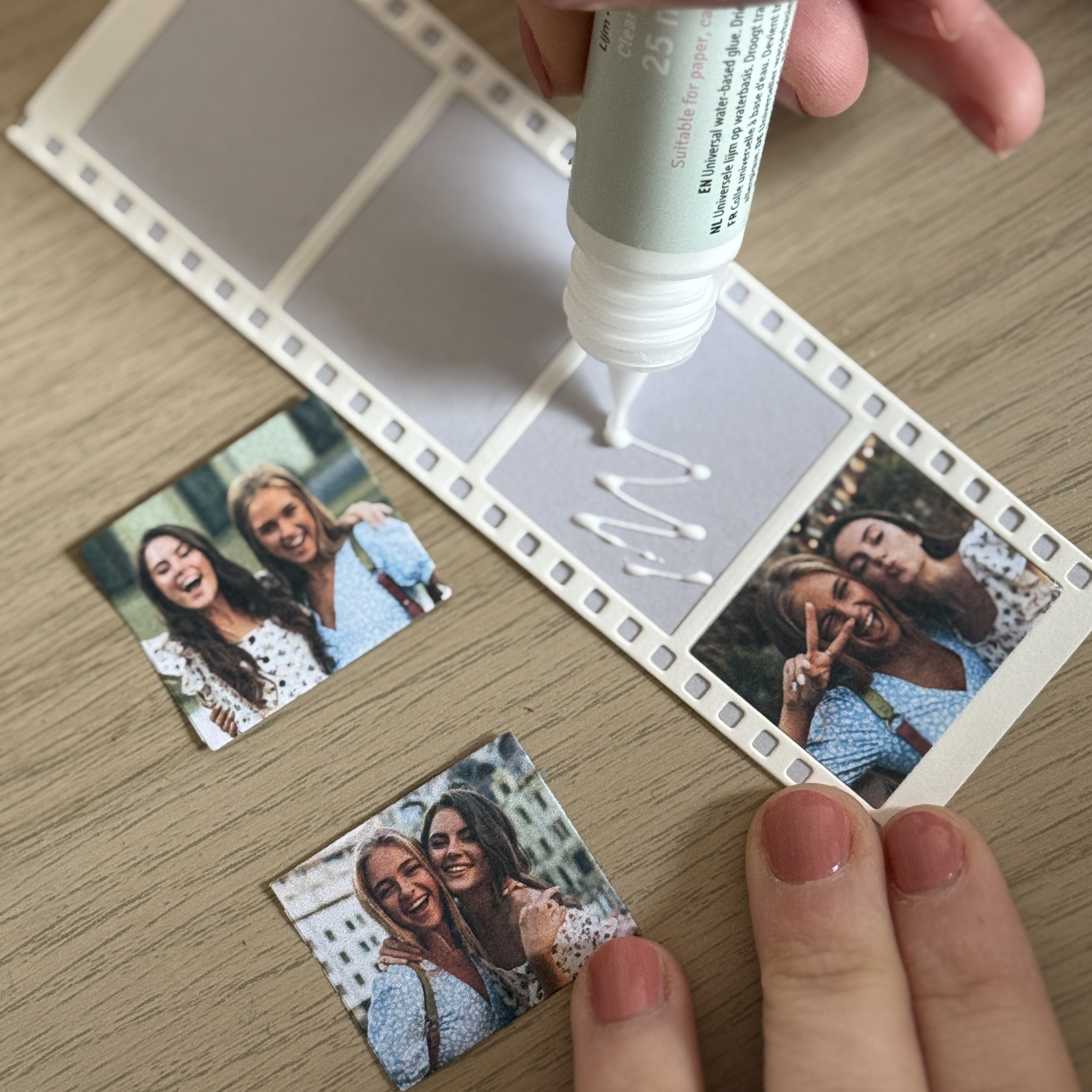 Bevestig de foto’s in de filmrol. In het bovenste frame kun je eventueel een leuke tekst stempelen.