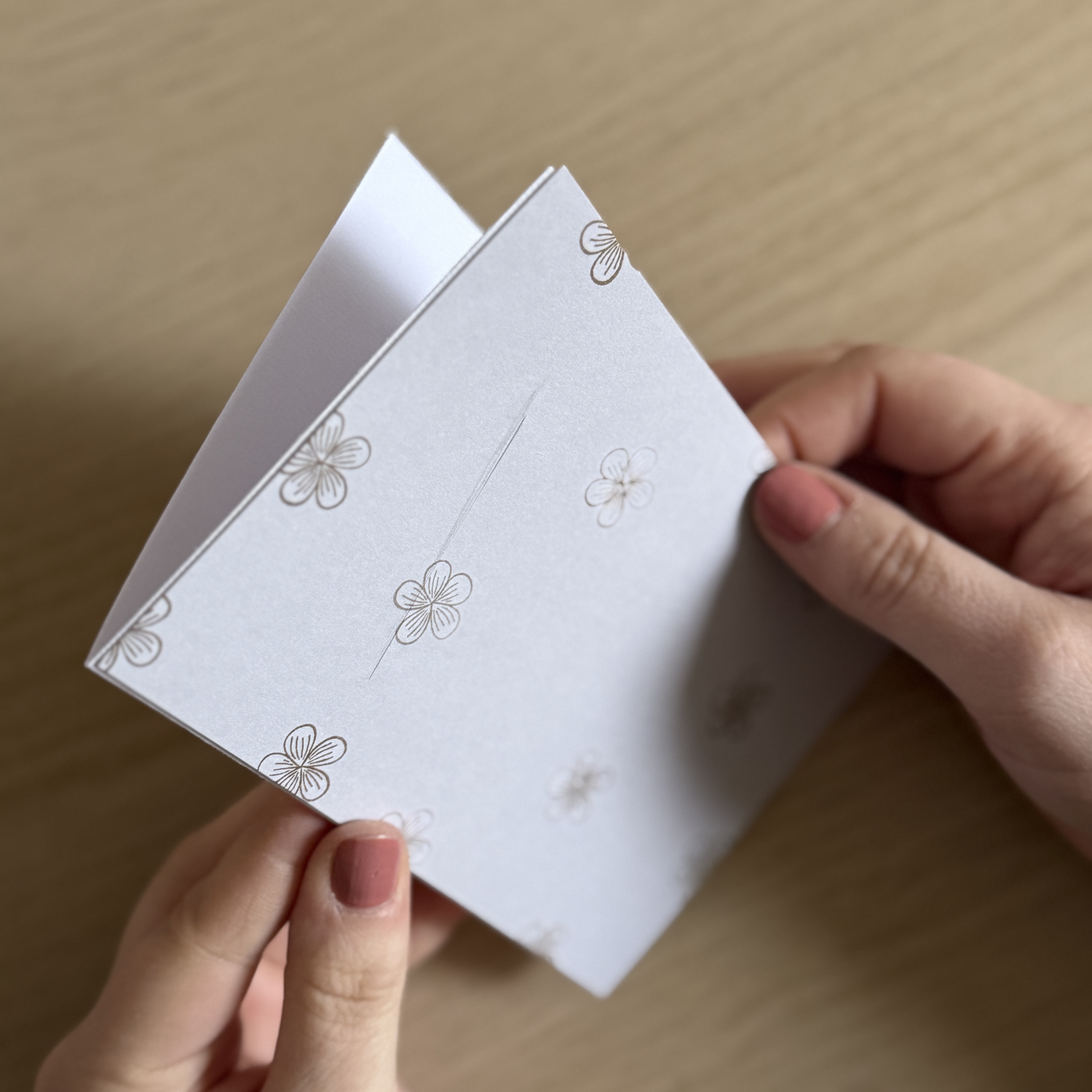 Plak dit vel op een dubbelgevouwen kaart. Wij gebruiken een kaart van 20 × 14,8 cm met een vouwlijn op 10 cm.