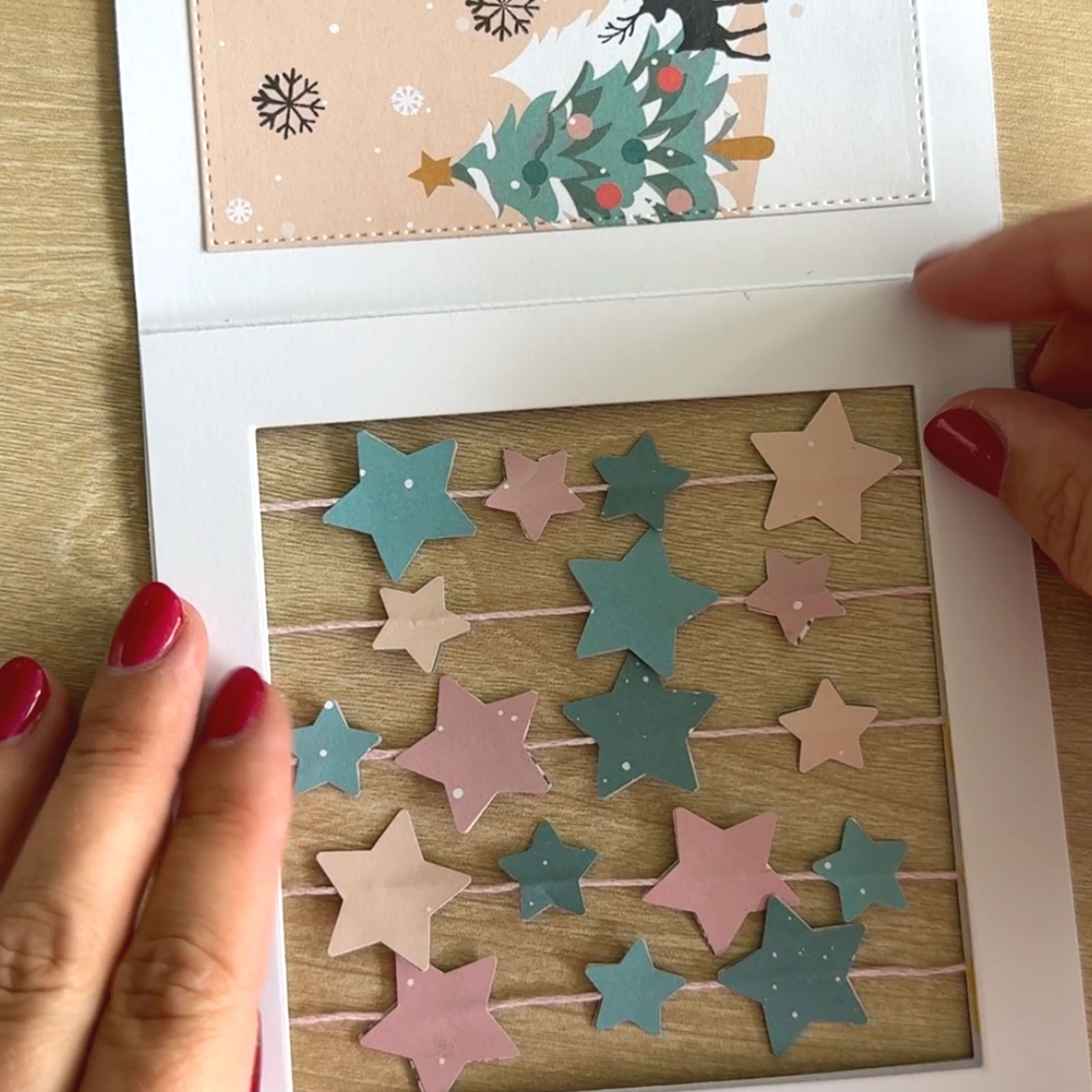 Op zoek naar een leuke kerstknutsel? Maak deze feestelijke kerstkaart met een venster en hangende sterren van papier. Leuk om te maken én extra speciaal om te versturen!