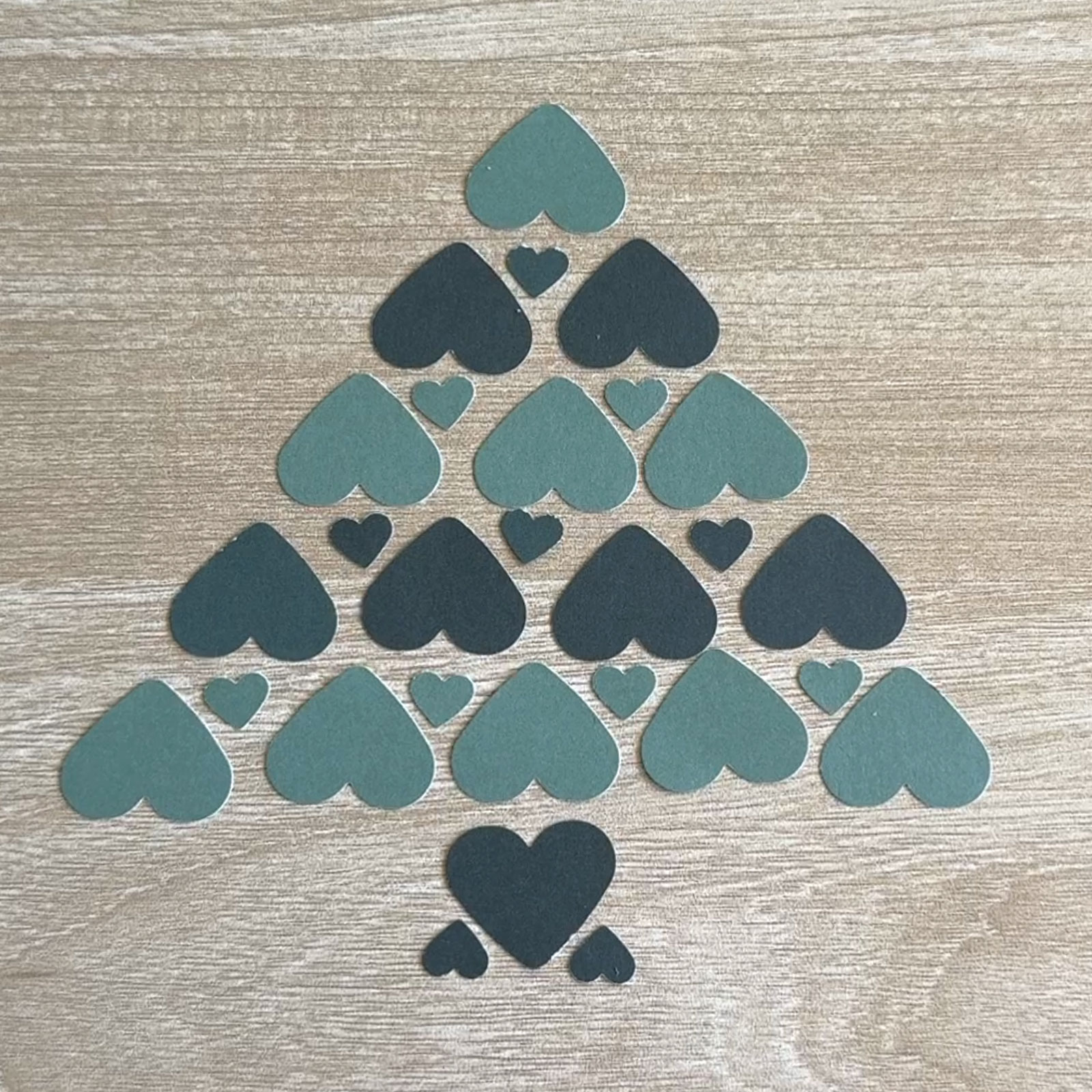 Neem twee donkerdere tinten groen en pons hier hartjes uit met de kleinste en middelste hartjespons uit de set.