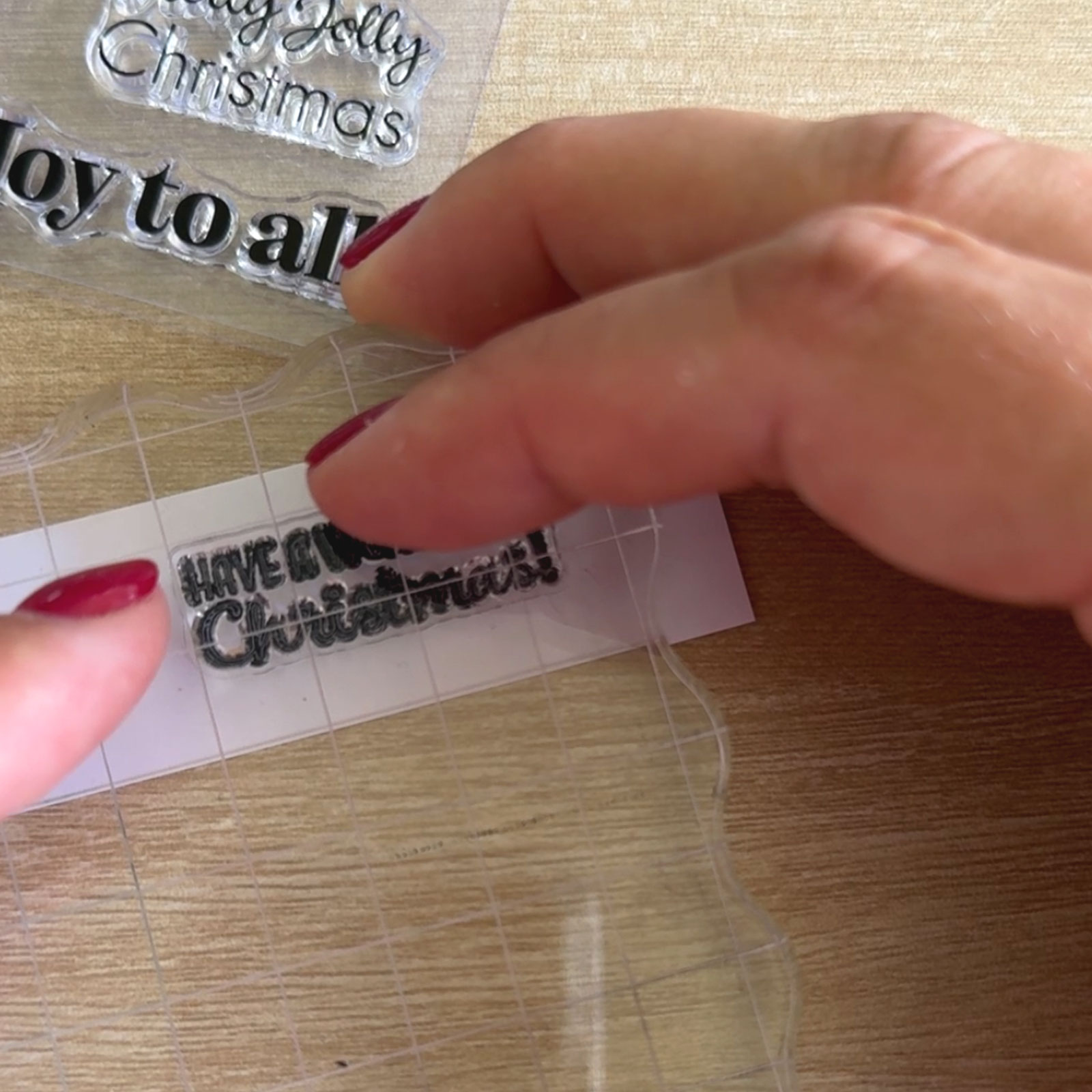 Neem een strookje wit papier en stempel hier een leuke kerstboodschap op. Snijd daarna uit op 4 x 2 cm. Snijd daarnaast een groen strookje van 4,5 x 2,5 cm en plak beide op elkaar.