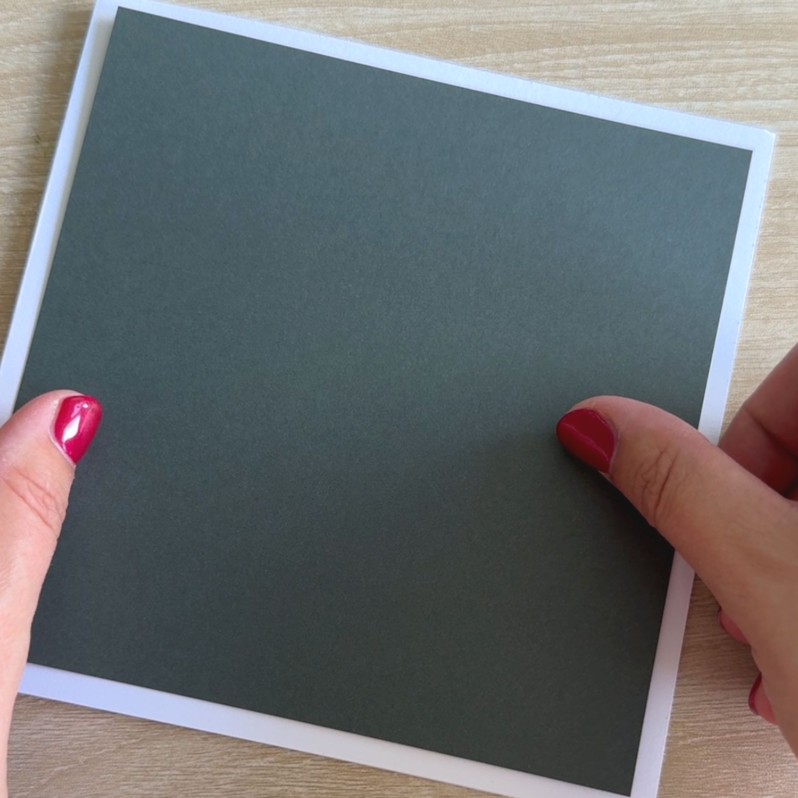 Pak er een dubbel gevouwen kaart bij van 15,5 x 15,5 cm. Snijd een vel donkergroen papier op maat van 14,5 x 14,5 cm en plak dit als achtergrond op de kaart.