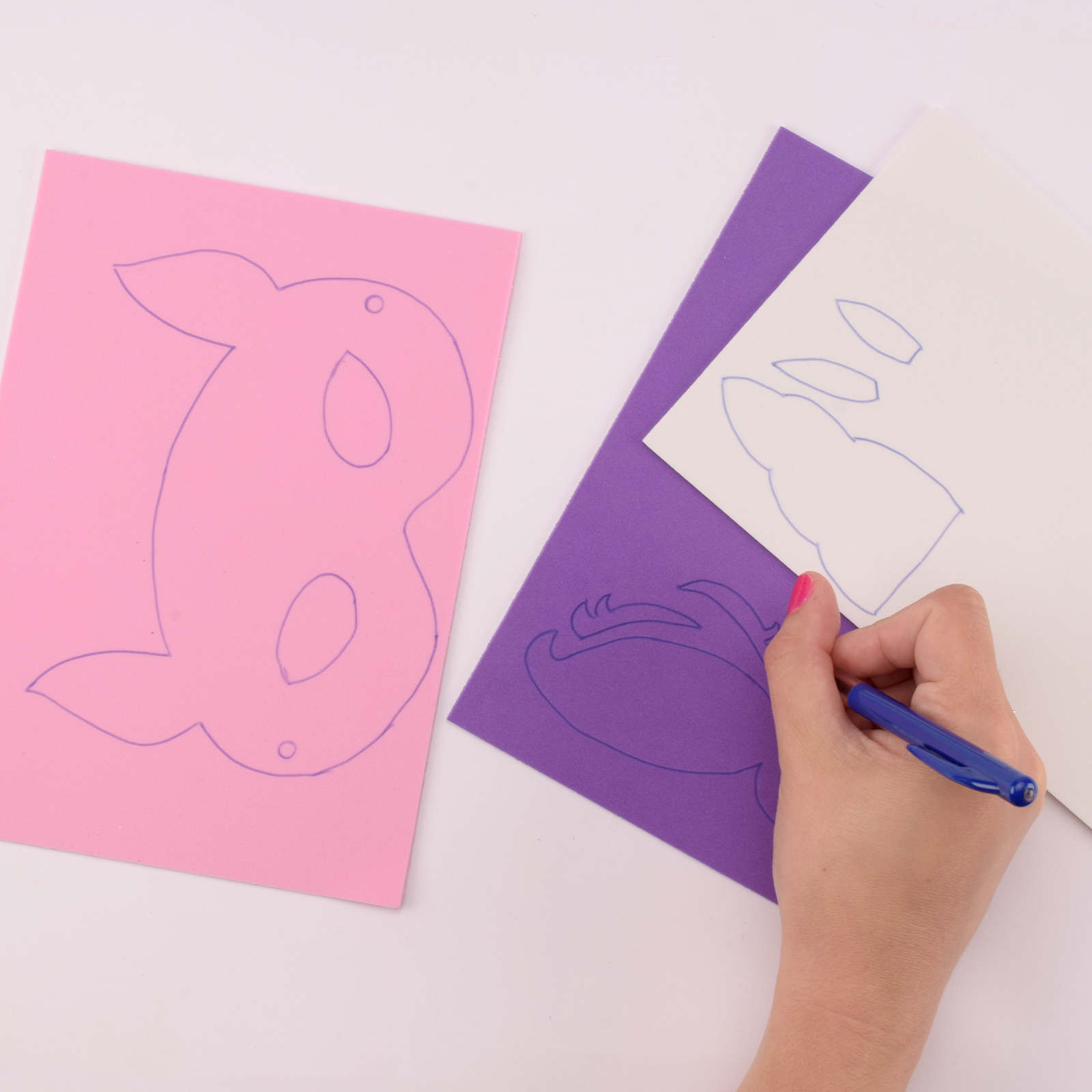 Maak eerst het unicorn masker. Gebruik het instructieboekje en drie kleuren glitterfoam uit de glitterkit. Trek met een pen de vormen over uit het boekje op het foam. Druk hard genoeg om een afdruk in het foam te maken.