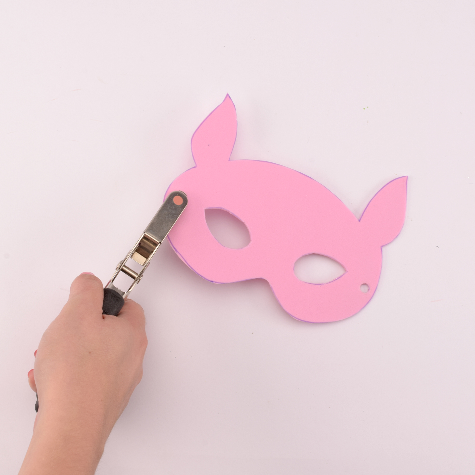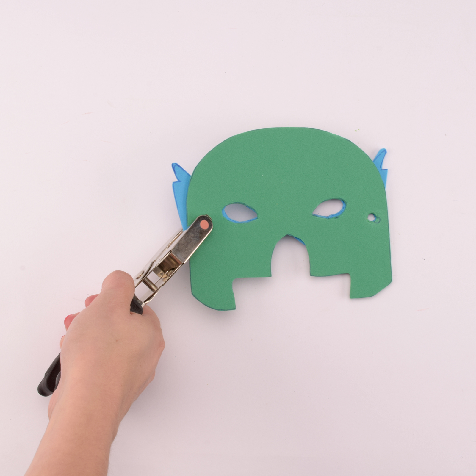 Maak gaatjes aan de zijkant van het masker met een handpons.