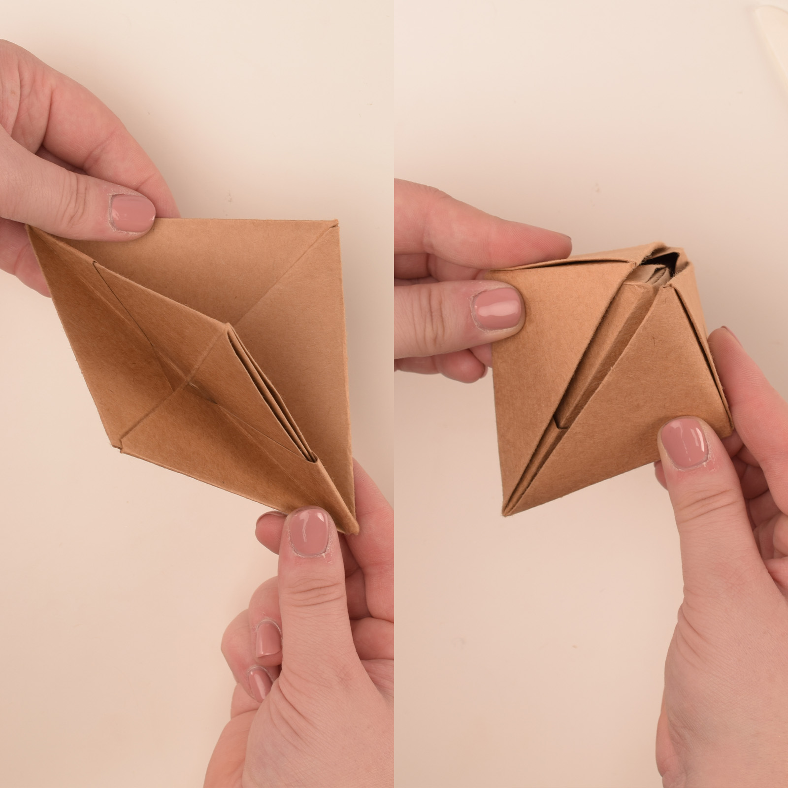 Open de onderkant opnieuw en trek de punten uit elkaar om weer een vierkant te vormen.