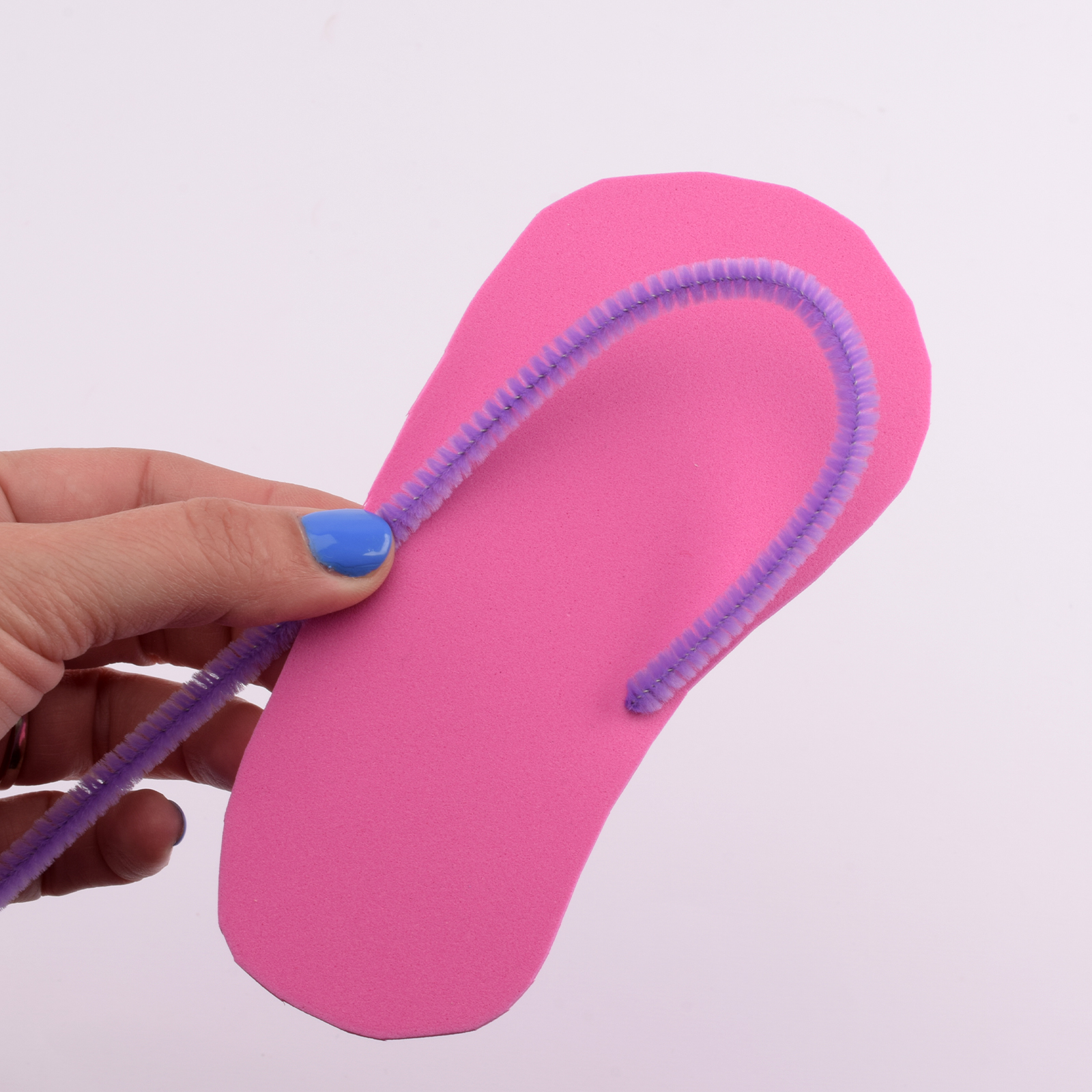 Neem voor elke slipper een chenilledraad. Knip ongeveer 8 cm van iedere draad af en leg dit apart. Gebruik het overgebleven stuk voor het bandje over de voet. Prik beide uiteinden door de onderste twee gemarkeerde plekken.