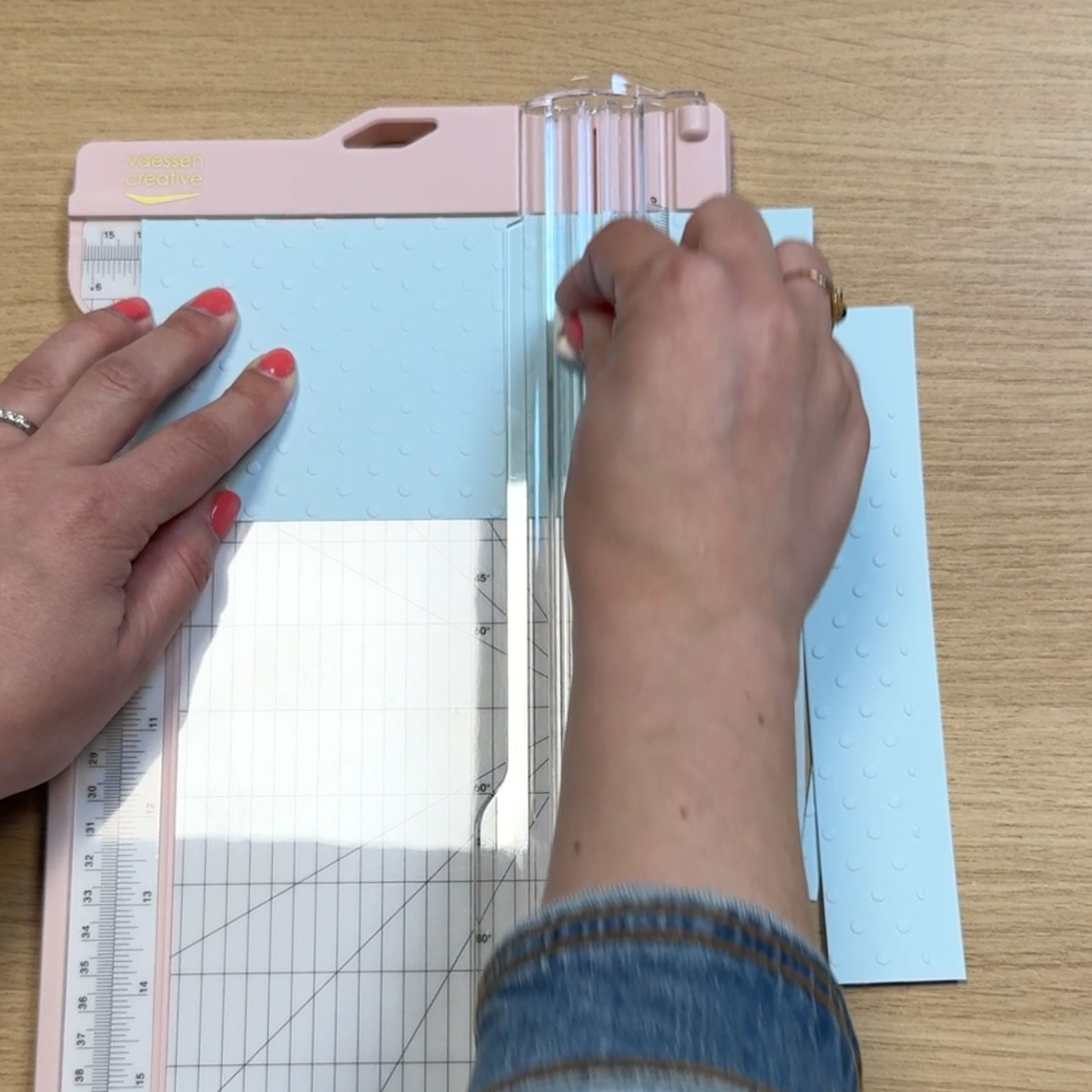 Snijd een stuk van 13,8 x 9,5 cm uit het blauwe geëmbosste papier.