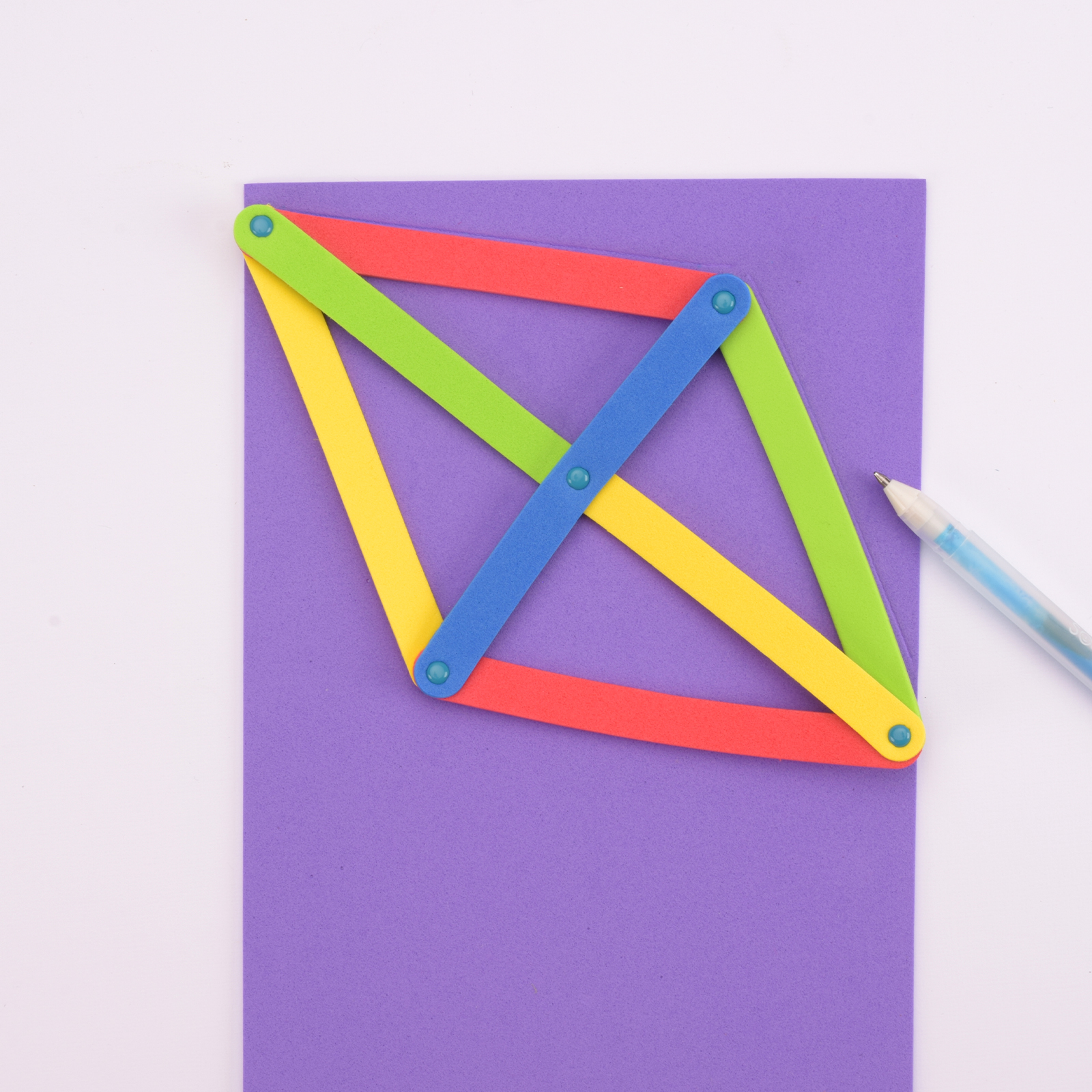 Gebruik nog twee foam lollystokjes voor de verticale stok. Bevestig deze eerst aan de uiteinden van de ruitvorm met een splitpen. Laat ze vervolgens samenkomen in het midden op het horizontale stokje.