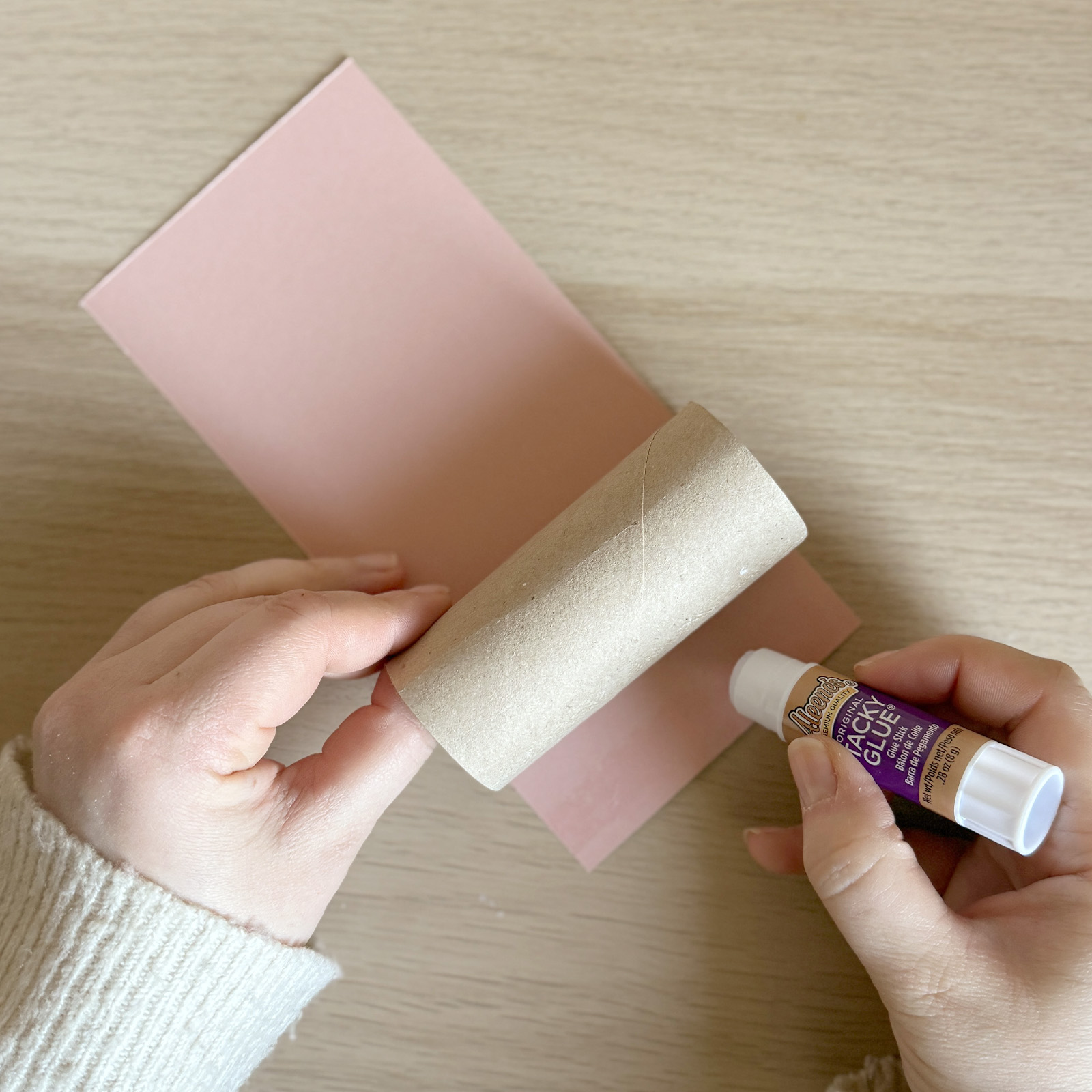 Knip een stuk papier op maat. Meet hiervoor eerst de hoogte van het rolletje. Breng lijm aan op één rand van het papier en plak deze rand vast aan het wc-rolletje.