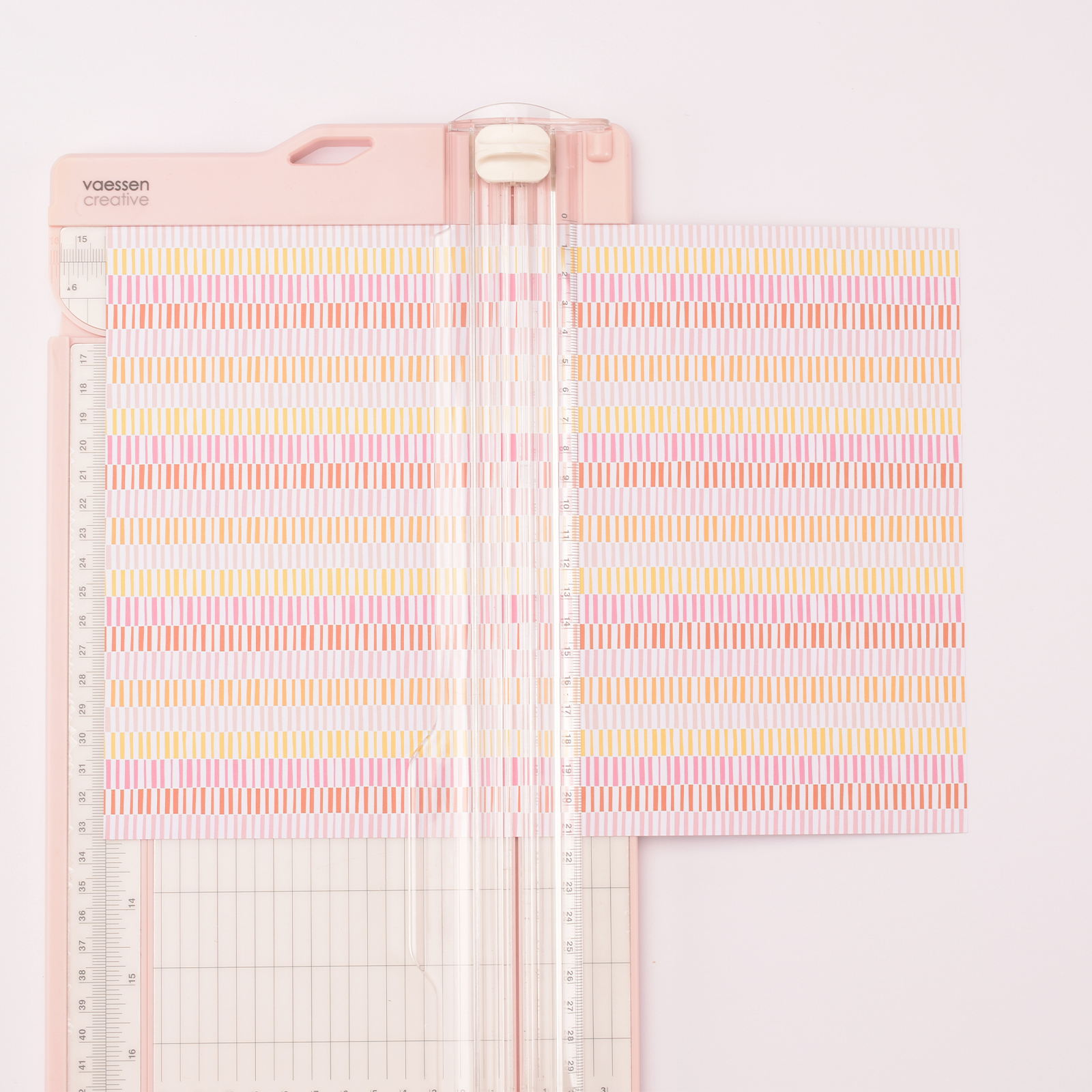 Gebruik het Fresh Lemonade papierblok van Marianne Design en kies een aantal vellen die je mooi vindt. Snijd het eerste vel met print op 14 x 14 cm.